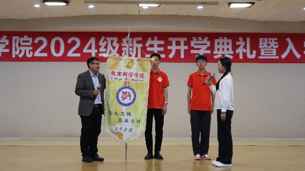 高军副院长为新生代表颁发院徽,院徽上印着我们的院训“爱生忠诲,求真日新”,同时院徽也承载着学院的历史、使命、价值观和精神风貌,希望可以激励新同学们为学院的发展和社会的进步而努力奋斗。