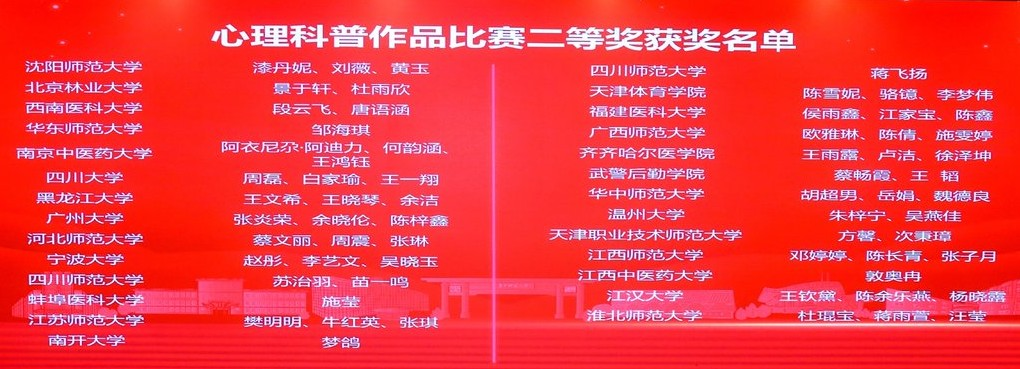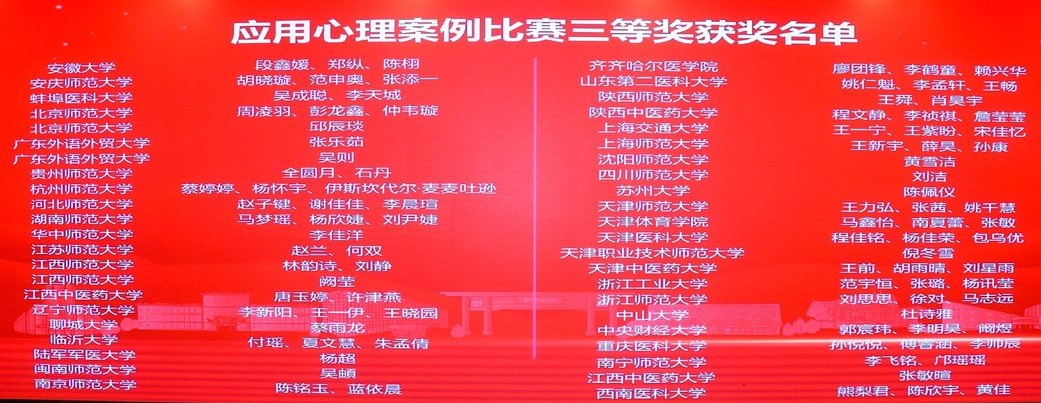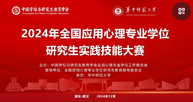 为深入贯彻党的二十大精神和全国研究生教育工作会议精神,进一步全面推进教育强国建设,由中国学位与研究生教育学会应用心理专业学位工作委员会主办,全国应用心理专业学位研究生教育指导委员会指导,华中师范大学心理学院承办的2024年全国应用心理专业学位研究生实践技能大赛决赛于2024127日至8日在华中师范大学南湖校区举行。我院学子最终在全国决赛中斩获心理科普作品比赛二等奖、应用心理案例开发比赛三等奖创造所有参赛作品均获奖的历史最好成绩!