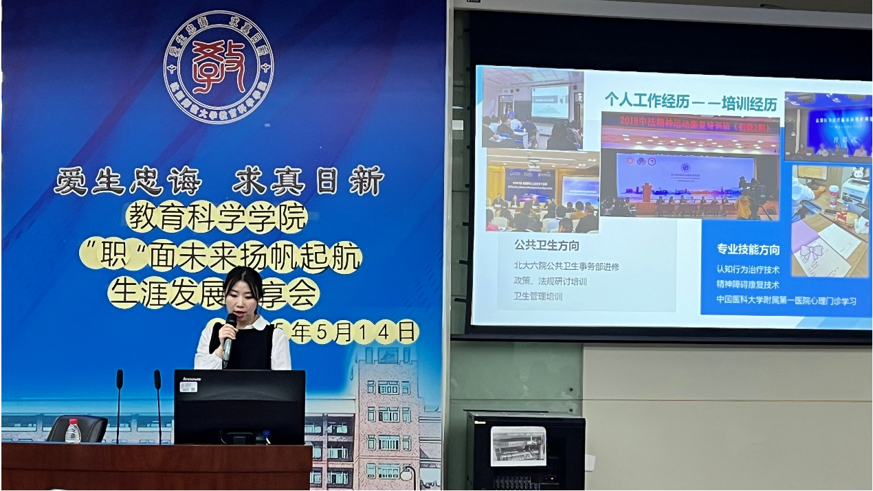 主持人王帅简要介绍到场嘉宾后,王璐学姐结合自身经历,从个人工作经历、社会心理服务政策、心理学就业方向三个方面展开分享。