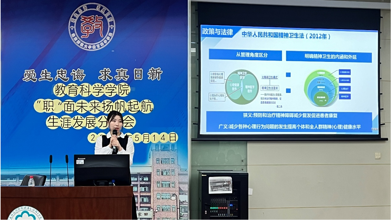 其次,王璐学姐结合国家政策与法律法规,解析了精神卫生与社会心理服务的最新动向。她建议同学们在校期间多关注跨地区政策,了解行业标准,以便在未来职业选择中占据主动。